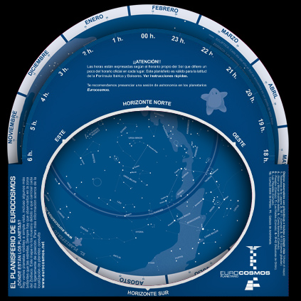 Puedes conseguir un planisferio en la página de Eurocosmos, cuyo funcionamiento está explicado en el siguiente vídeo con el fin de poder utilizarlo para localizar las constelaciones: