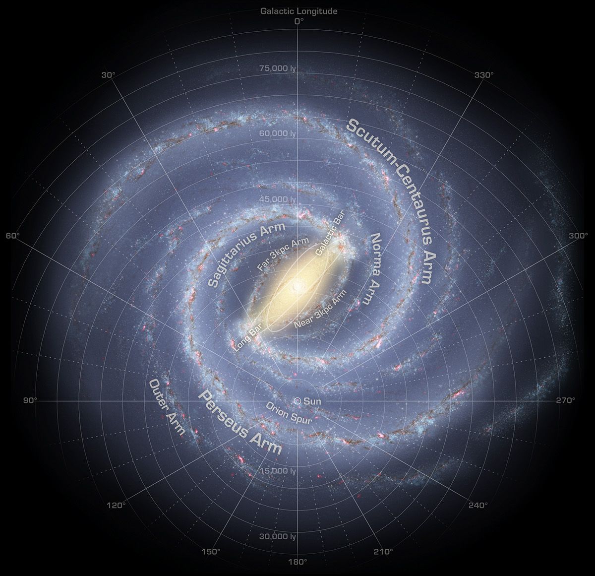 The artist’s concept also includes a new spiral arm, called the «Far-3 kiloparsec arm,» discovered via a radio-telescope survey of gas in the Milky Way. This arm is shorter than the two major arms and lies along the bar of the galaxy.