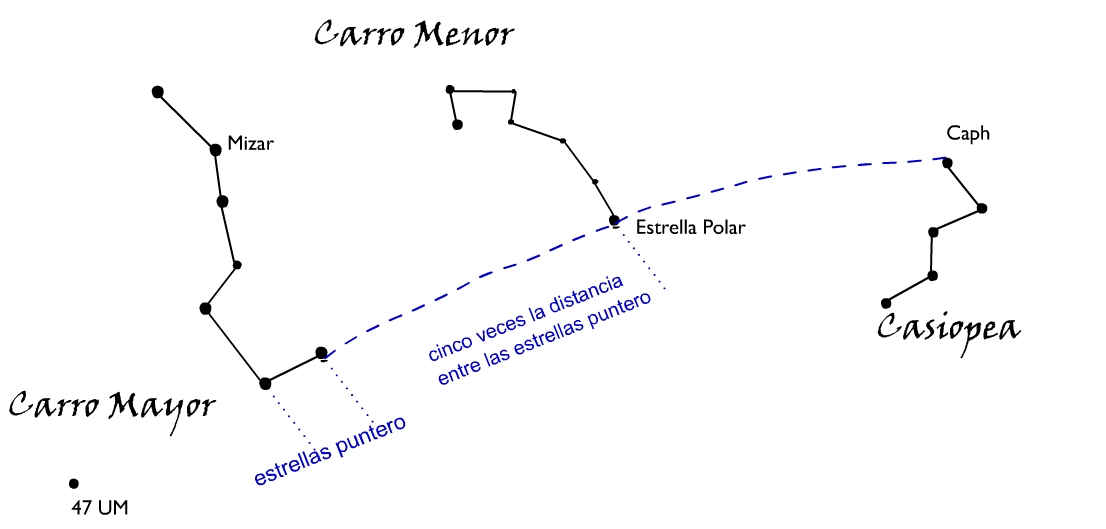 - Localiza las dos últimas estrellas del Carro Mayor, las llamadas estrellas puntero (Dubhe y Merak).