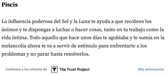Predicción del horóscopo para el signo del zodíaco Piscis elaborada por el diario 20minutos (Fuente de la imagen)