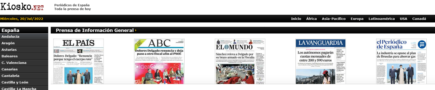 Enlaces a periódicos de España disponibles desde la página Kiosko.net