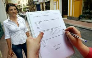 Persona realizando una encuesta en papel a un participante en la investigación. Fuente: Wikimedia Commons