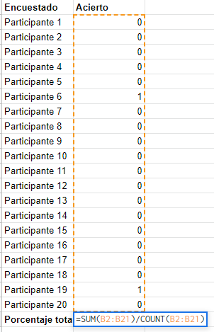 Función de cálculo del porcentaje de aciertos. La función SUM(B2:B21) suma todas las celdas desde la B2 a la B21; la función COUNT(B2:B21) cuenta todas las celdas con números desde la B2 a la B21. Fuente: elaboración propia.
