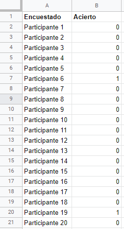2. Construye una hoja de cálculo como la que muestra la imagen. En la primera columna se pone el número de encuestado, en la segunda columna marca con un 0 si no ha acertado con un 1 si lo ha hecho.