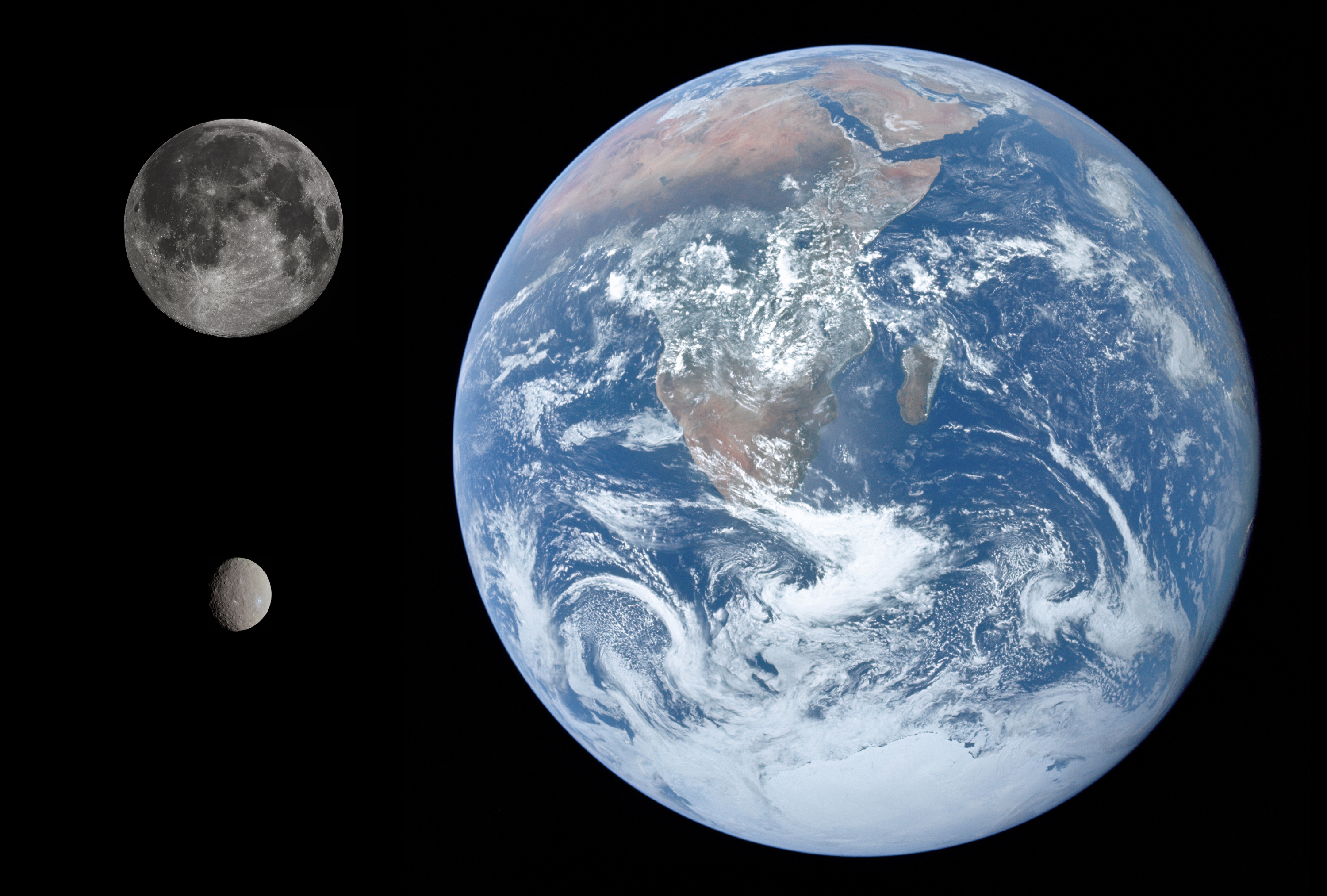 Ceres, Luna y Tierra a la misma escala. Fuente Wikimedia Commons