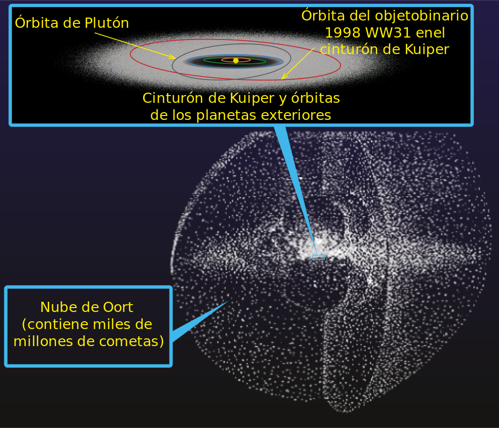 Representación de la nube de Oort en comparativa con el cinturón de Kuiper. Fuente: Wikimedia Commons